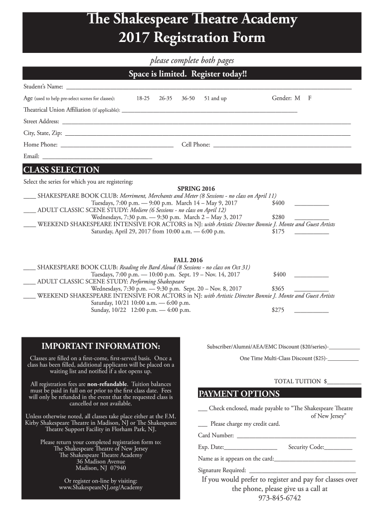 The Shakespeare Theater Academy 2017 Registration Form please complete both pages Space is limited. Register today!! Students Name: Age (used to help preselect scenes for classes):1825 2635 3650 51
