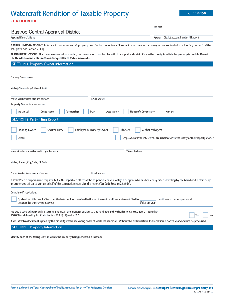 Watercraft Rendition of Taxable PropertyForm 50158CONFIDENTIALTax Year Bastrop Central Appraisal District Appraisal Districts Reappraisal District Account Number (if known)GENERAL INFORMATION: This