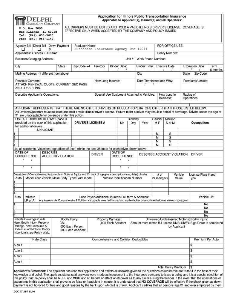 Application for Illinois Public Transportation Insurance Applicable to Applicant(s), Insured(s) and all Operators: ALL DRIVERS MUST BE LISTED AND HOLD A VALID ILLINOIS DRIVER S LICENSE. COVERAGE IS