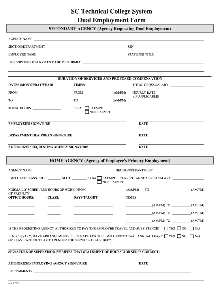 The Dual Employment Form is a document used by employees of the SC Technical College System to request approval for secondary employment.