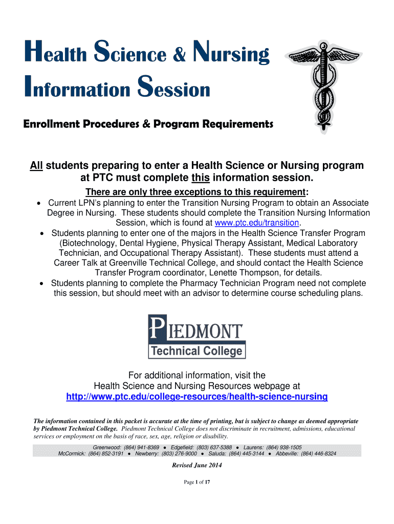 Health Science & Nursing Information Session Enrollment Procedures & Program Requirements All students preparing to enter a Health Science or Nursing program at PTC must complete this information