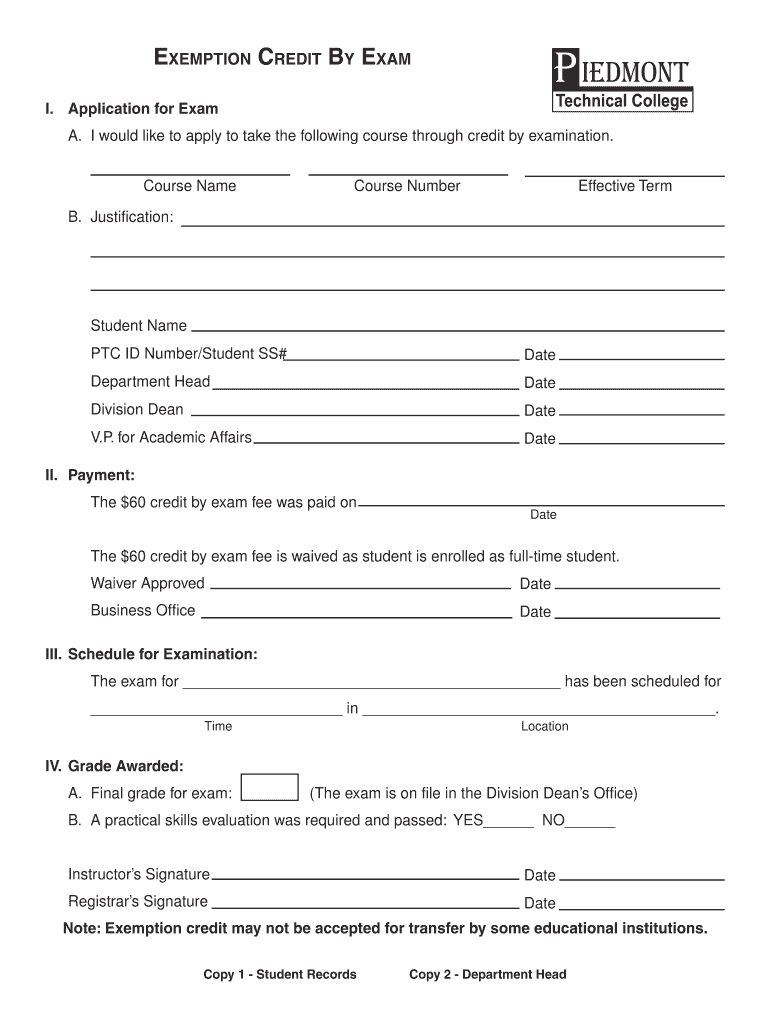Exemption Credit By Exam I. Application for Exam A. I would like to apply to take the following course through credit by examination. Course Name Course Number Effective Term B. Justification: Student
