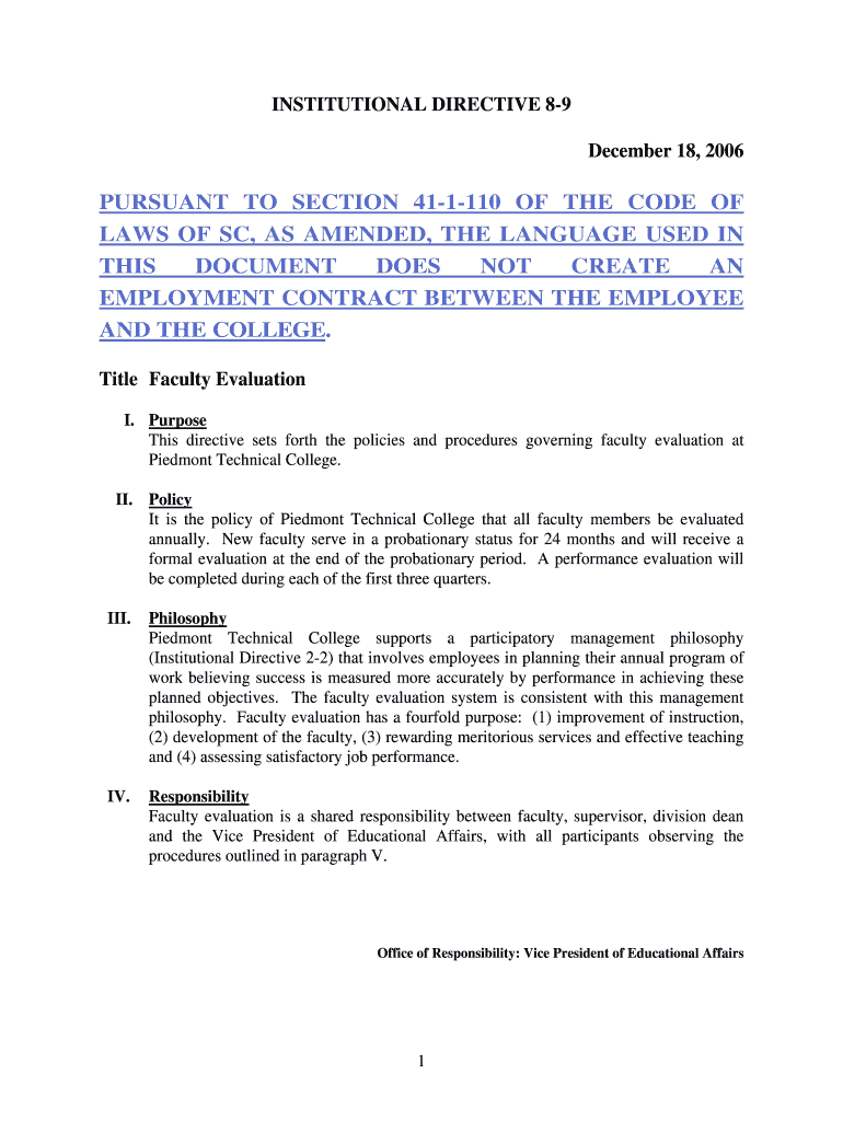 INSTITUTIONAL DIRECTIVE 89 December 18, 2006, PURSUANT TO SECTION 411110 OF THE CODE OF LAWS OF SC, AS AMENDED, THE LANGUAGE USED IN THIS DOCUMENT DOES NOT CREATE AN EMPLOYMENT CONTRACT BETWEEN THE