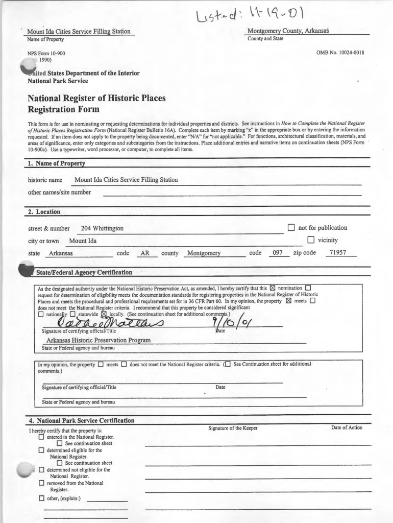 Mount Ida Cities Service Filling Station Montgomery County, Arkansa5Name of PropertyCounty and State NPS Form 10900.:!. 1990)OMB No. 100240018ited States Department of the Interior National Park ServiceNational