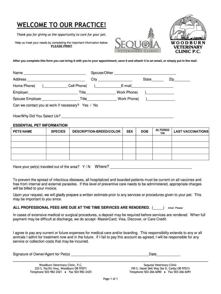 WELCOME TO OUR PRACTICE! Thank you for giving us the opportunity to care for your pet. Help us meet your needs by completing the important information below. PLEASE Printer you complete this form