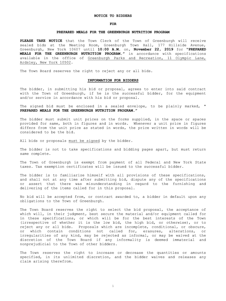 NOTICE TO BIDDERS FOR PREPARED MEALS FOR THE GREENBERG NUTRITION PROGRAM PLEASE TAKE NOTICE that the Town Clerk of the Town of Green burgh will receive sealed bids at the Meeting Room, Green burgh