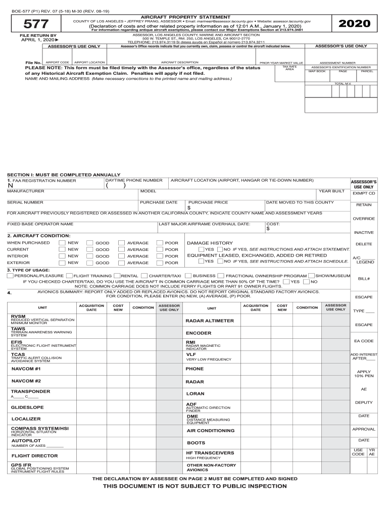 BOE577 (P1) REV. 07 (518) M30 (REV. 0819)AIRCRAFT PROPERTY STATEMENT577(Declaration of costs and other related property information as of 12:01 A.M., January 1, 2020)For information regarding antique