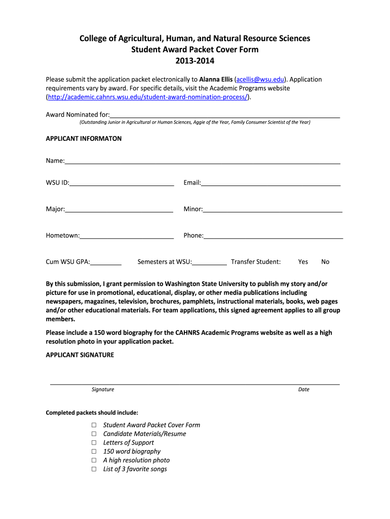 College of Agricultural, Human, and Natural Resource Sciences Student Award Packet Cover Form 20132014 Please submit the application packet electronically to Alana Ellis (cells WSU.edu). Application