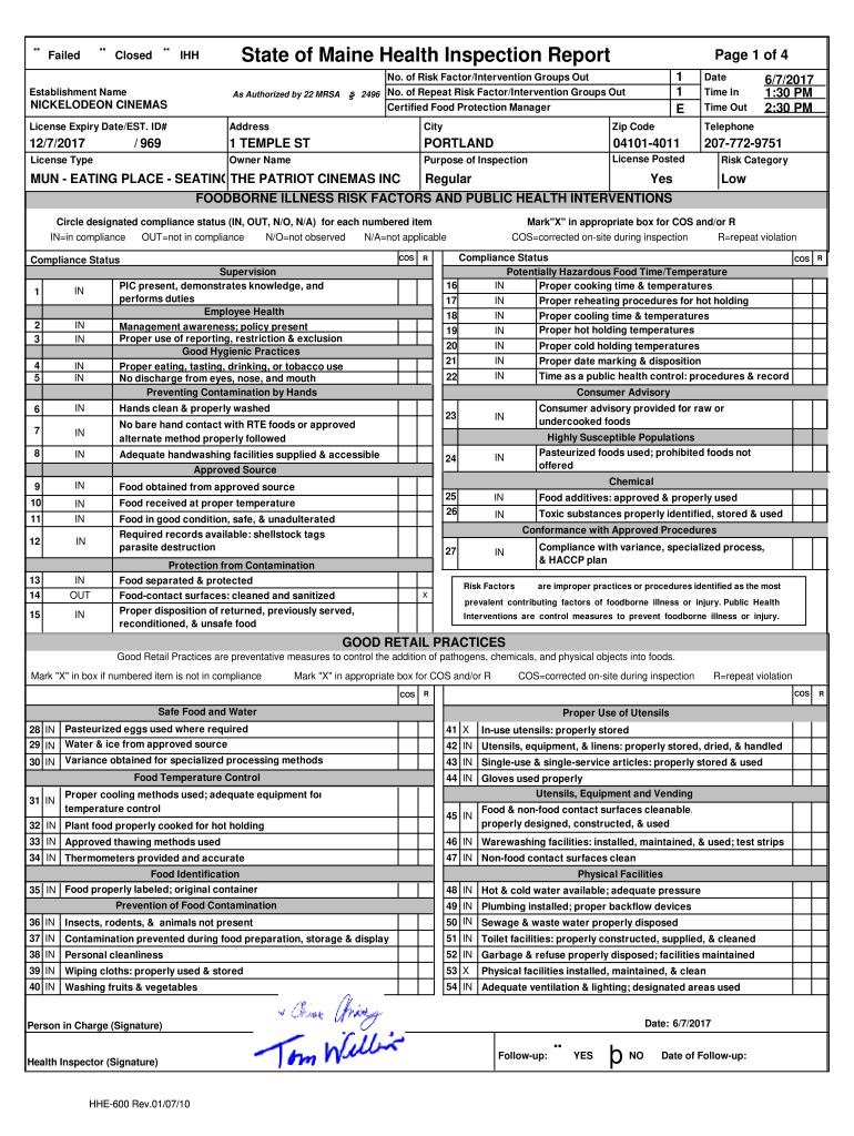 Failed Closed Instate of Maine Health Inspection Reportage 1 of 4No. Of Risk Factor/Intervention Groups Out
