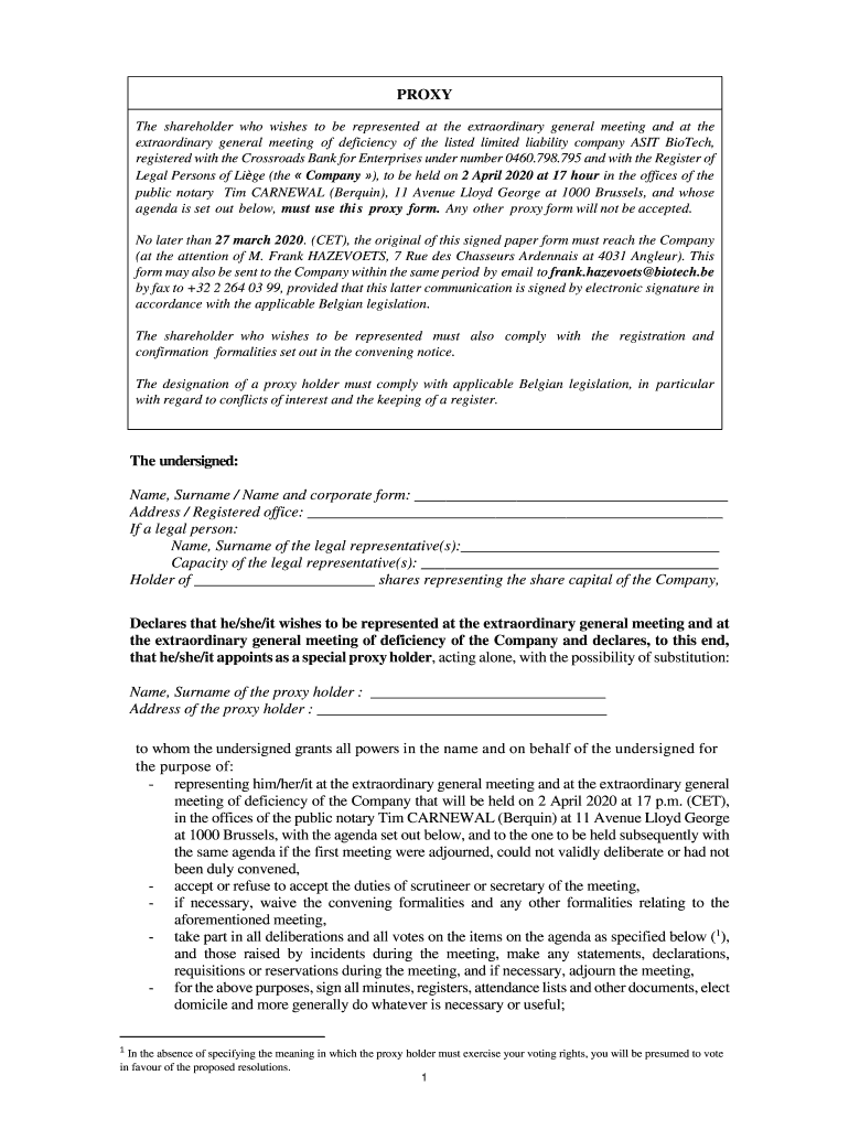 PROXY The shareholder who wishes to be represented at the extraordinary general meeting and at the extraordinary general meeting of deficiency of the listed limited liability company ASIA BioTech,