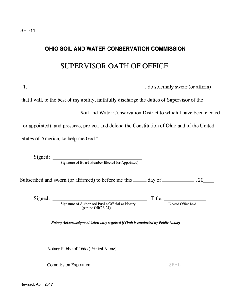 SEL11OHIO SOIL AND WATER CONSERVATION COMMISSIONSUPERVISOR OATH OF OFFICE I, do solemnly swear (or affirm) that I will, to the best of my ability, faithfully discharge the duties of Supervisor of