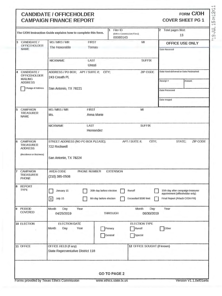 CAMPAIGN FINANCE REPORTFORMC/COVER SHEET PG 1Ln. I1