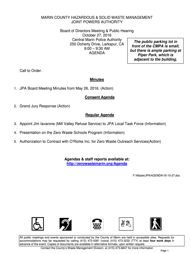 MARIN COUNTY HAZARDOUS & SOLID WASTE MANAGEMENT JOINT POWERS AUTHORITY Board of Directors Meeting & Public Hearing October 27, 2016, Central Marin Police Authority The public parking lot in 250 Doherty