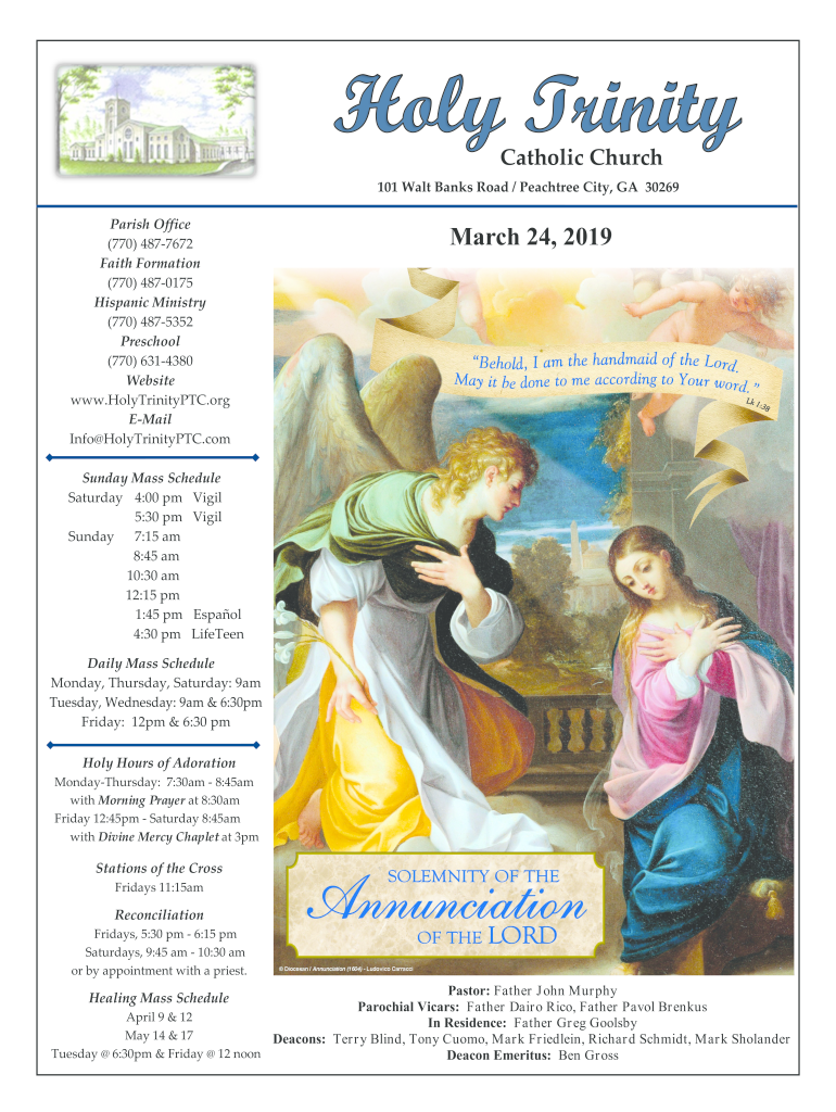 Catholic Church 101 Walt Banks Road / Peachtree City, GA 30269 Parish Office (770) 4877672 Faith Formation (770) 4870175 Hispanic Ministry (770) 4875352 Preschool (770) 6314380 Website www.HolyTrinityPTC.org