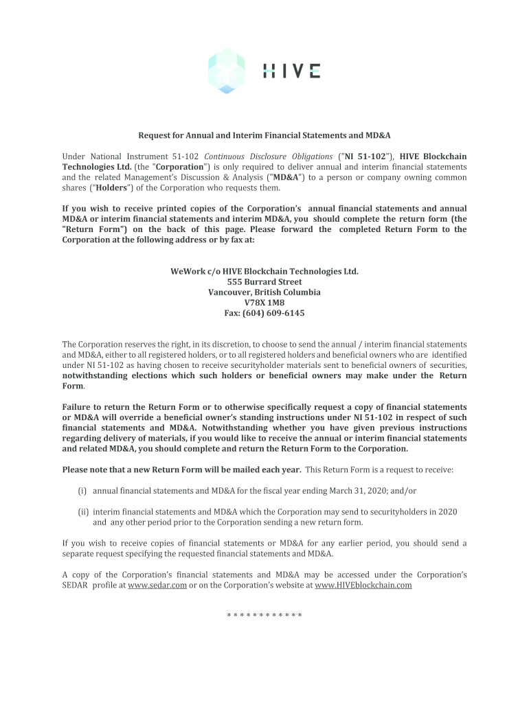 Request for Annual and Interim Financial Statements and MD&AUnderNationalInstrument51102ContinuousDisclosureObligations(“NI51102 “), HIVEBlockchainTechnologies Ltd. (the “Corporation “)isonlyrequiredtodeliverannualandinterimfinancialstatementsand