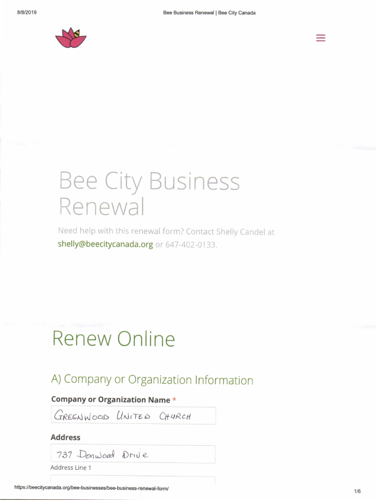 A&2019Be Busines3 Renal I BS City CsnadaBee City Business RenewaINeed help with this renewal form? Contact Shelly Cancel at Shelly beecirycanada.org or 647 40201 33. Renew Online A) Company or Organization