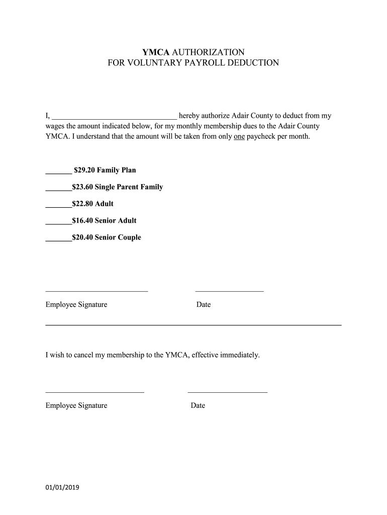 Get the free YMCA AUTHORIZATION FOR VOLUNTARY PAYROLL DEDUCTION