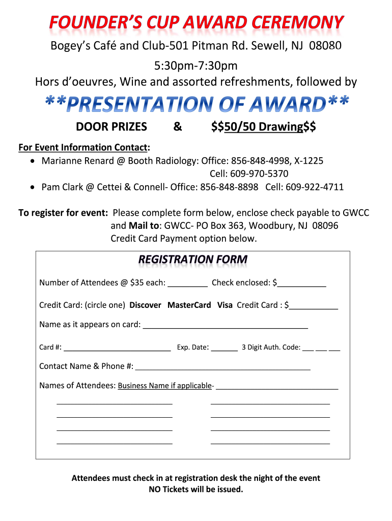 BogeysCafandClub501PitmanRd. Sewell,NJ08080 5:30pm7:30pm Hors d'oeuvres, Wineandassortedrefreshments, followed by DOORPRIZES&$$50/50Drawing$$ ForEventInformationContact: MarianneRenard BoothRadiology:Office:8568484998,×1225