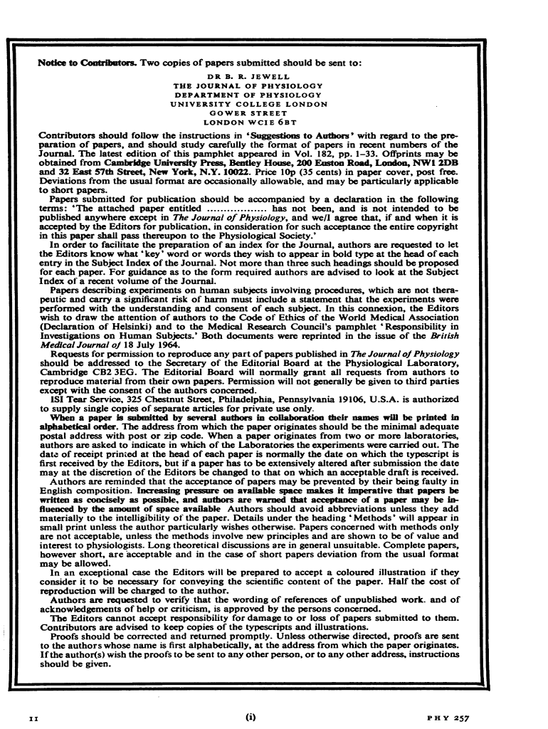 Notice to Contributor Two copies of papers submitted should be sent to: DR B. R. JEWELL THE JOURNAL OF PHYSIOLOGY DEPARTMENT OF PHYSIOLOGY UNIVERSITY COLLEGE LONDON POWER STREET LONDON CIE 6BTContributors