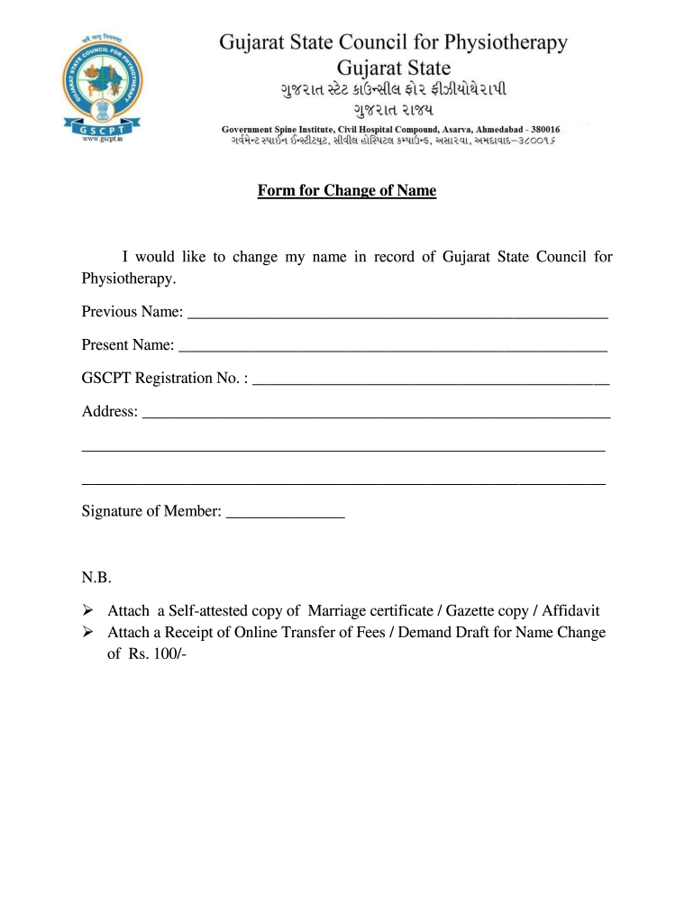 Form for Change of Name would like to change my name in record of Gujarat State Council for Physiotherapy. Previous Name: Present Name: GSC PT Registration No. Address: Signature of Member: N.B.