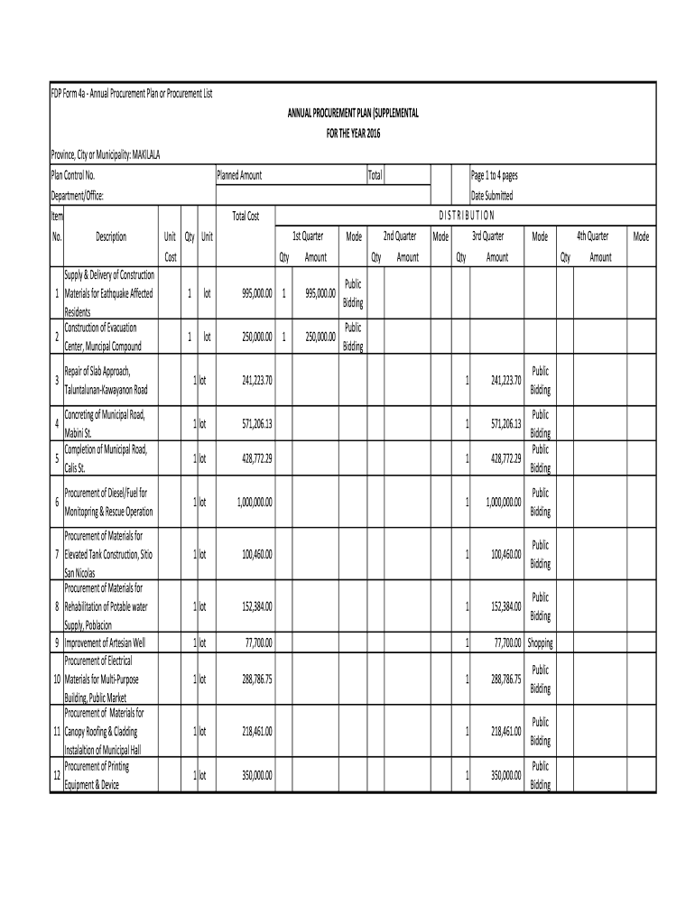 FDP Form 4a Annual Procurement Plan or Procurement List ANNUAL PROCUREMENT PLAN (SUPPLEMENTAL FOR THE YEAR 2016 Province, City or Municipality: MAXILLA Plan Control No. Department/Office: Item No.