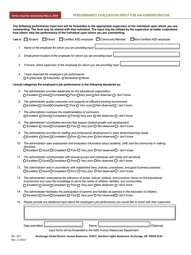 Forms must be received by May 3, 2019PERFORMANCE EVALUATION INPUT FOR AN Administrator following performance input tool will be forwarded to the appropriate supervisor of the individual upon whom