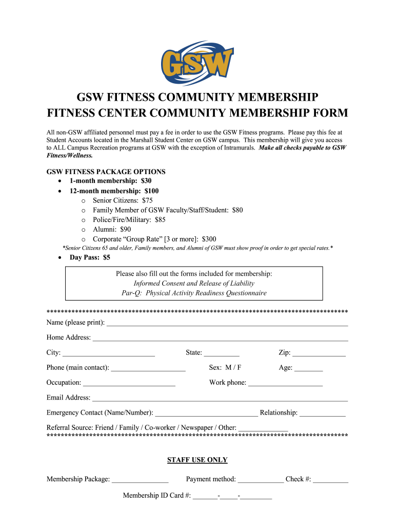 GSW FITNESS COMMUNITY MEMBERSHIP FITNESS CENTER COMMUNITY MEMBERSHIP FORM All nonGSW affiliated personnel must pay a fee in order to use the GSW Fitness programs. Please pay this fee at Student Accounts