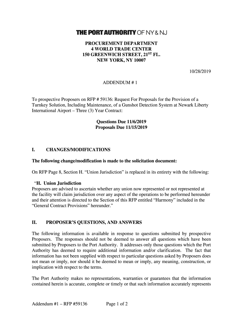 PROCUREMENT DEPARTMENT 4 WORLD TRADE CENTER 150 GREENWICH STREET, 21ST FL. NEW YORK, NY 10007 10/28/2019 ADDENDUM # 1To prospective Proposers on RFP # 59136: Request For Proposals for the Provision