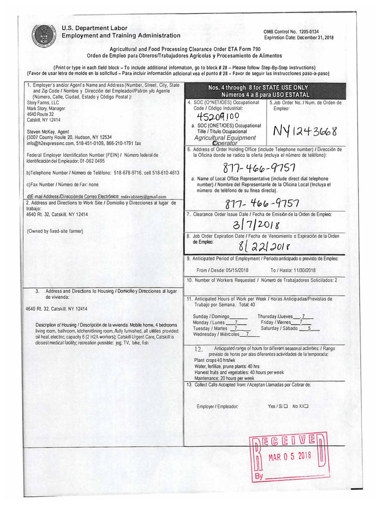 U.S. Department Labor Employment and Training Administration0MB Control No. 12050134 Expiration Date: December 31, 2018Agricultural and Food Processing Clearance Order ETA Form 790 Order de Empleo