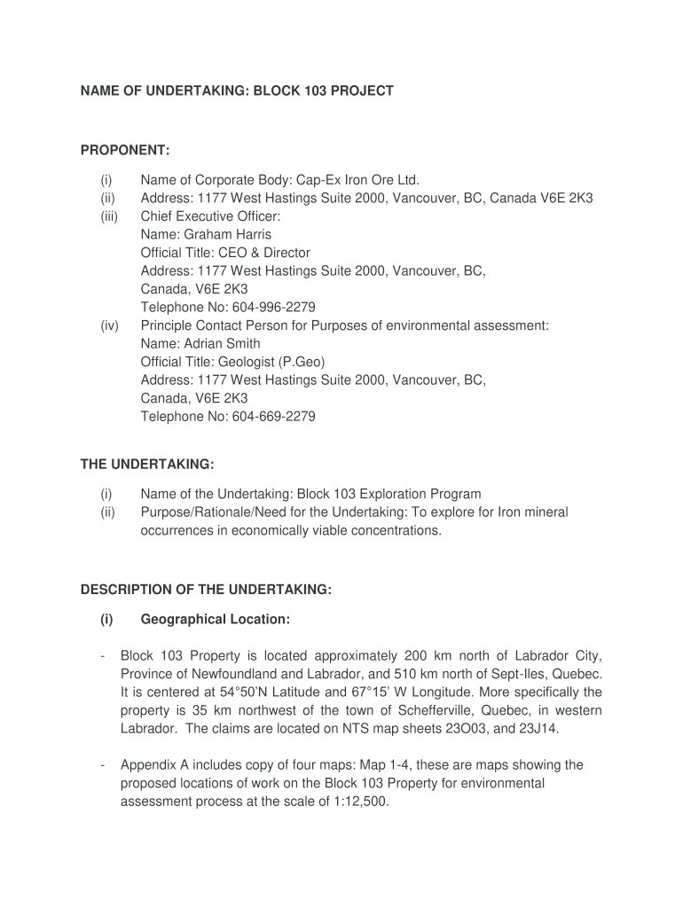 NAME OF UNDERTAKING: BLOCK 103 PROJECTPROPONENT: (i) (ii) (iii)(iv)Name of Corporate Body: Iron Ore Ltd. Address: 1177 West Hastings Suite 2000, Vancouver, BC, Canada V6E 2K3 Chief Executive Officer: