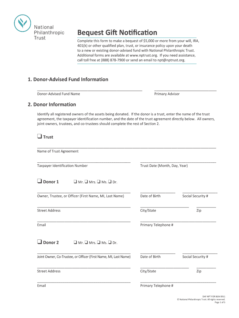 The Bequest Gift Notification Form is a personal finance document used by donors or trustees to officially notify the intended allocation of a bequest of $5,000 or more to a donor-advised fund.
