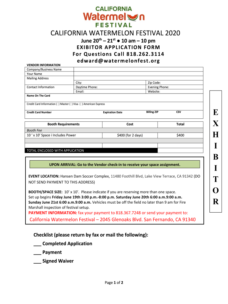 CALIFORNIA WATERMELON FESTIVAL 2020VENDOR INFORMATION Company/Business Name Your Name Mailing Address June 20th 21st 10 am 10 pm EXHIBITOR APPLICATION FORM For Questions Call 818.262.3114 Edward watermelon