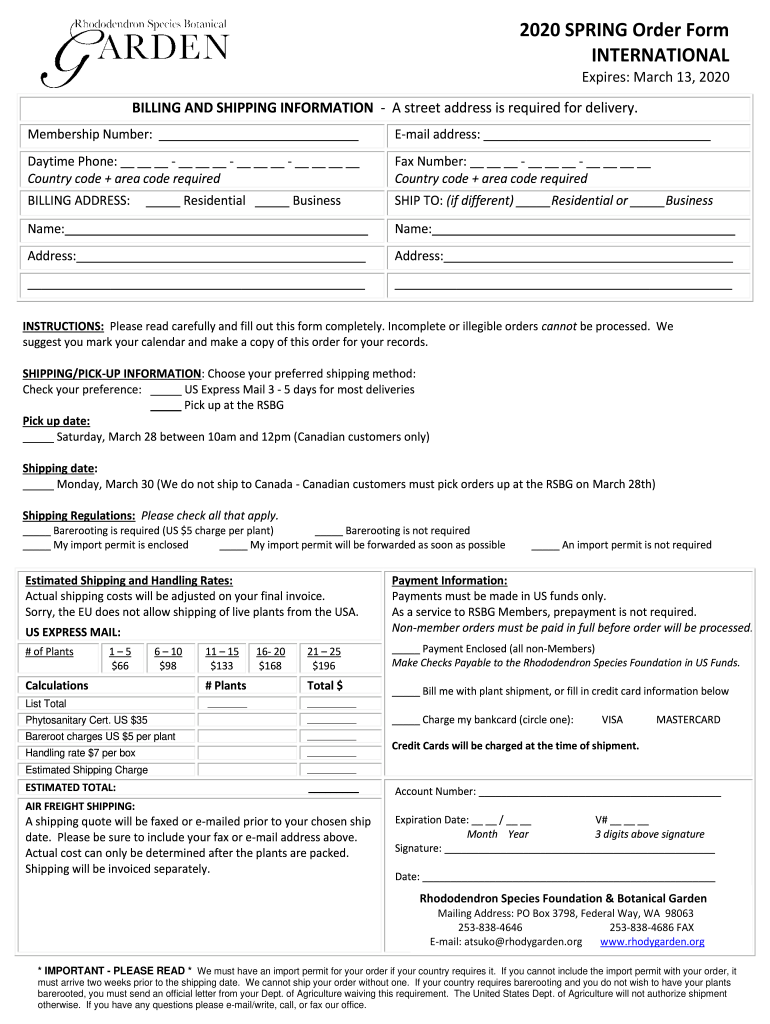 2020 SPRING Order Form INTERNATIONAL Expires: March 13, 2020, BILLING AND SHIPPING INFORMATION A street address is required for delivery. Membership Number: Email address: Daytime Phone: Country code