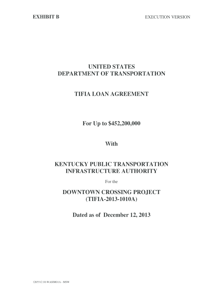EXHIBIT EXECUTION VERSIONUNITED STATES DEPARTMENT OF TRANSPORTATION TIBIA LOAN Agreement Up to $452,200,000 With KENTUCKY PUBLIC TRANSPORTATION INFRASTRUCTURE AUTHORITY For downtown CROSSING PROJECT