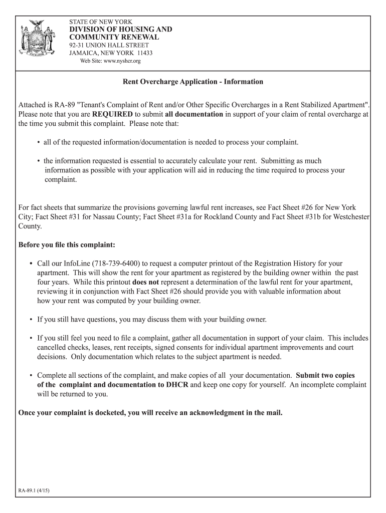 STATE OF NEW YORKDIVISION OF HOUSING AND COMMUNITY RENEWAL 9231 UNION HALL STREET JAMAICA, NEW YORK 11433 Website: www.nyshcr.orgRent Overcharge Application Information Attached is RA89 “Tenant's
