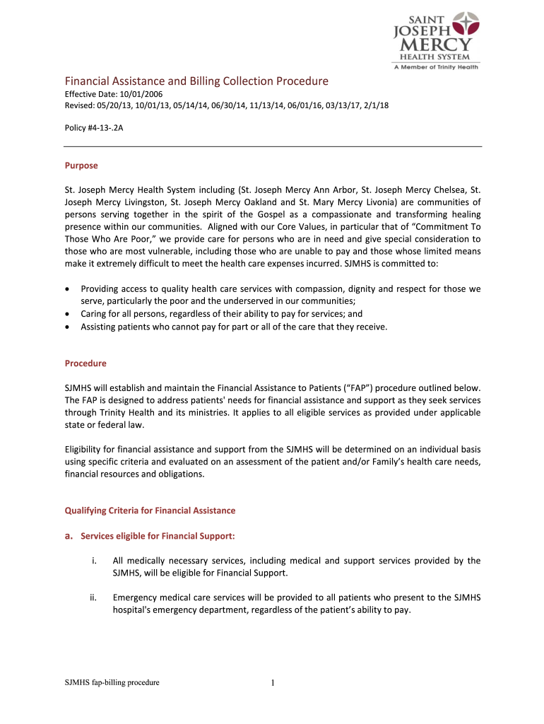 SAINT, JOSEPH 'MERCY HEALTH SYSTEM Member of TrinityHealthFinancial Assistance and Billing Collection Procedure Effective Date: 10/01/2006 Revised: 05/20/13, 10/01/13, 05/14/14, 06/30/14, 11/13/14,