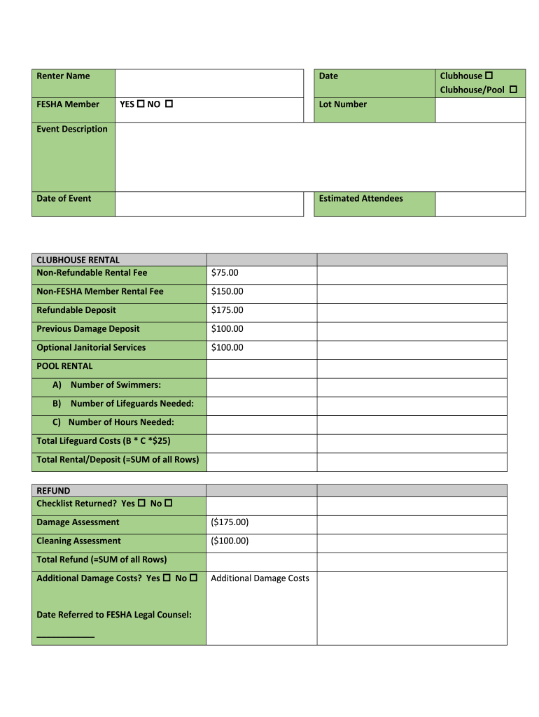Renter Name FES HA Membrane YES NO Lot NumberEvent DescriptionDate of Overestimated AttendeesCLUBHOUSE RENTAL NonRefundable Rental Fee$75.00NonFESHA Member Rental Fee$150.00Refundable Deposit$175.00Previous