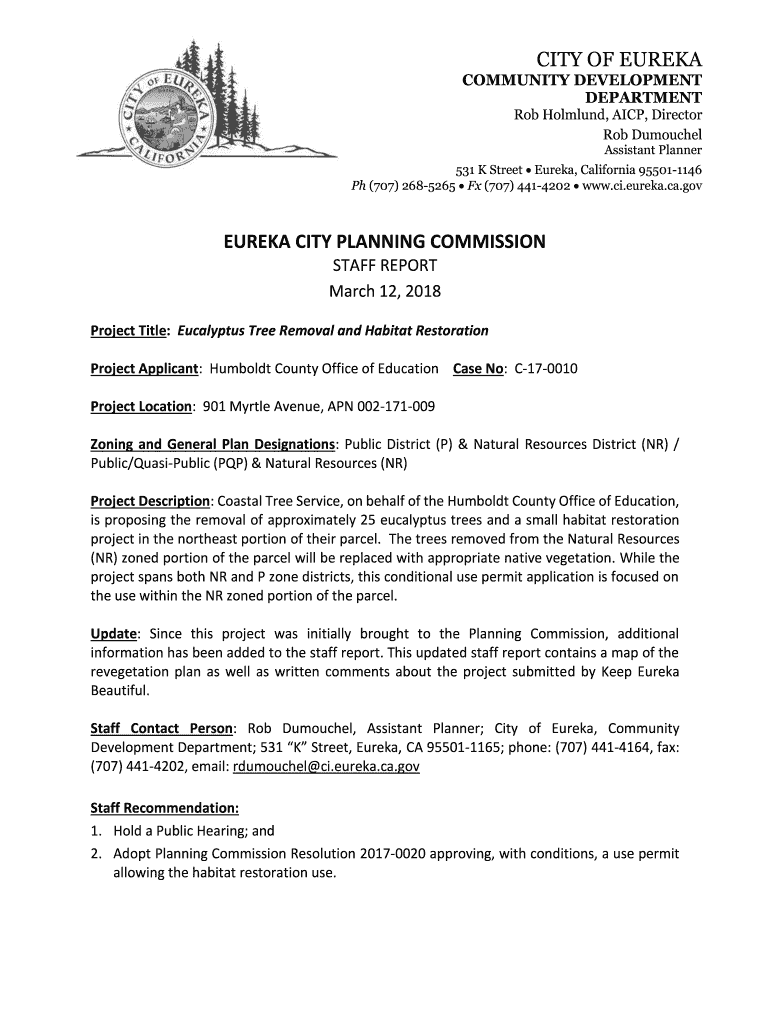 CITY OF EUREKA COMMUNITY DEVELOPMENT DEPARTMENT Rob Holland, ICP, Director Rob Durocher Assistant Planner531 K Street Eureka, California 955011146 pH (707) 2685265 FX (707) 4414202 www.ci.eureka.ca.govEUREKA
