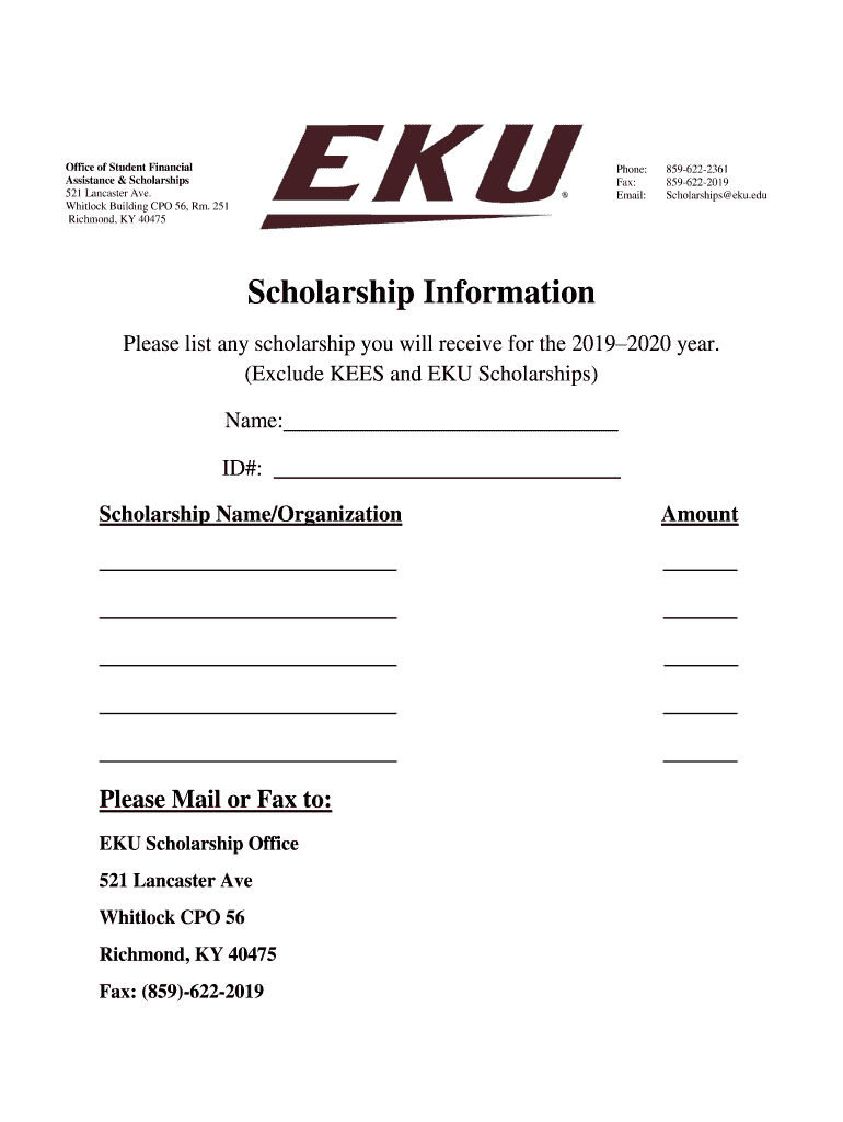 Office of Student Financial Assistance & Scholarships 521 Lancaster Ave. Whitlock Building CPO 56, Rm. 251 Richmond, KY 40475Phone: Fax: Email:8596222361 8596222019 Scholarships EU.scholarship Information