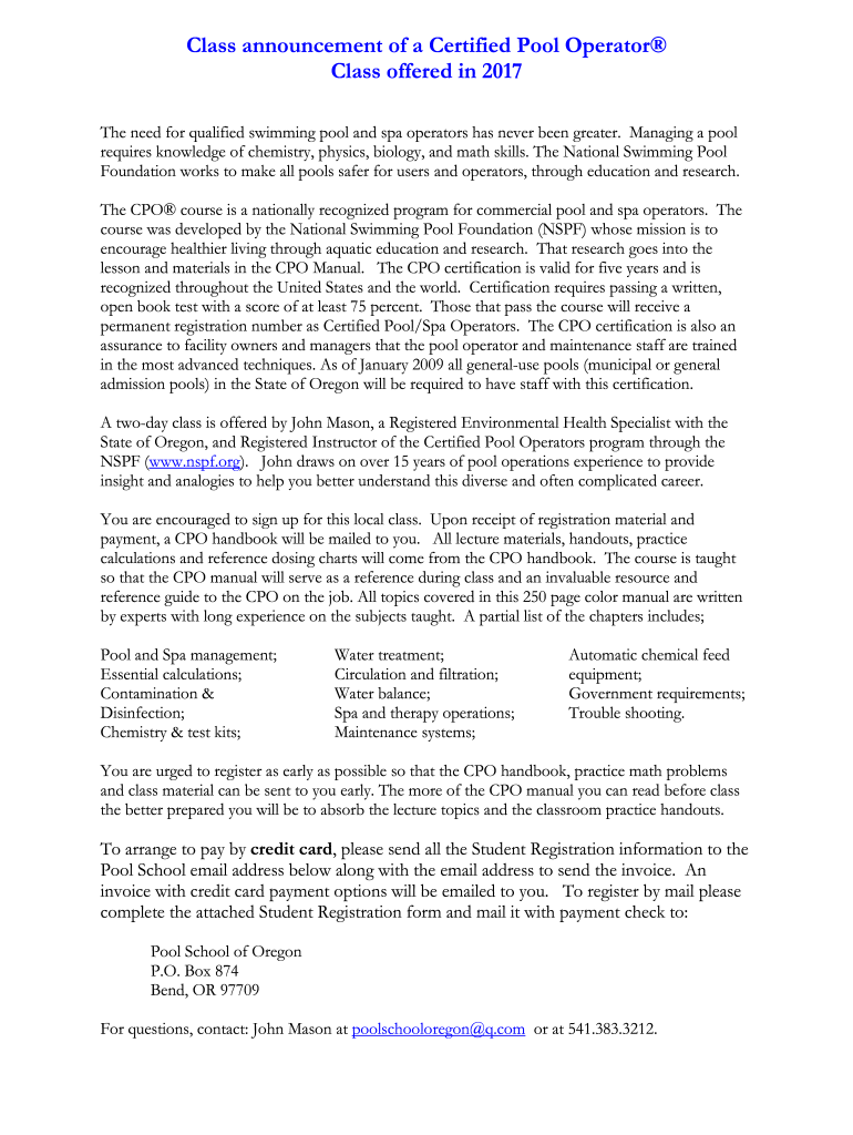 Get the free Class announcement of a Certified Pool Operator Class ...