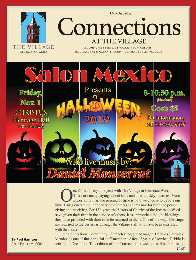 Oct. Dec. 2019Connections AT THE VILLAGE COMMUNITY SERVICE PROGRAM SPONSORED BY THE VILLAGE AT INCARNATE WORD PUBLIC WELCOMESalon Mexico Presents Friday, Nov. 1810:30 p.m. (No class)Cost: $5CHRISTUS