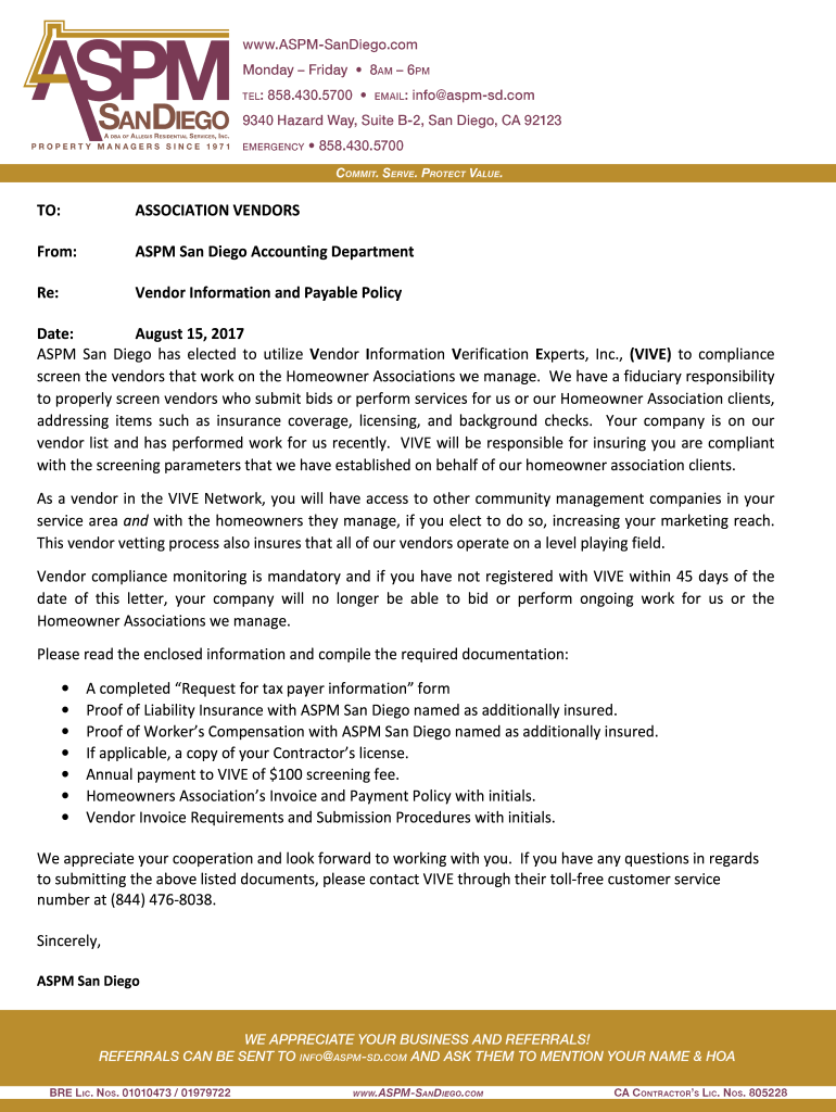 TO:ASSOCIATION VENDORSFrom:APM San Diego Accounting Department Re:Vendor Information and Payable Policymaker: