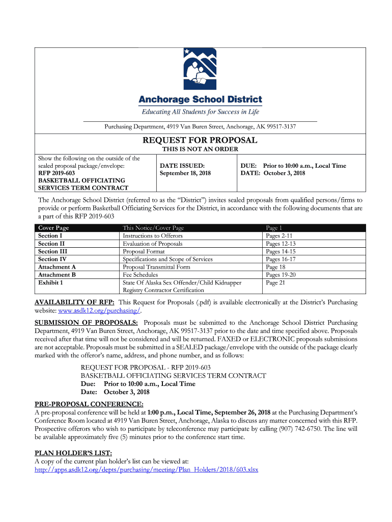 Purchasing Department, 4919 Van Buren Street, Anchorage, AK 995173137REQUEST FOR PROPOSAL THIS IS NOT AN ORDERS how the following on the outside of the sealed proposal package/envelope: RFP 2019603