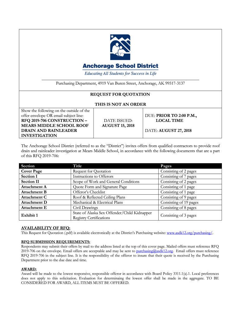 Purchasing Department, 4919 Van Buren Street, Anchorage, AK 995173137 REQUEST FOR QUOTATION THIS IS NOT AN ORDER Show the following on the outside of the offer envelope OR email subject line: RFQ