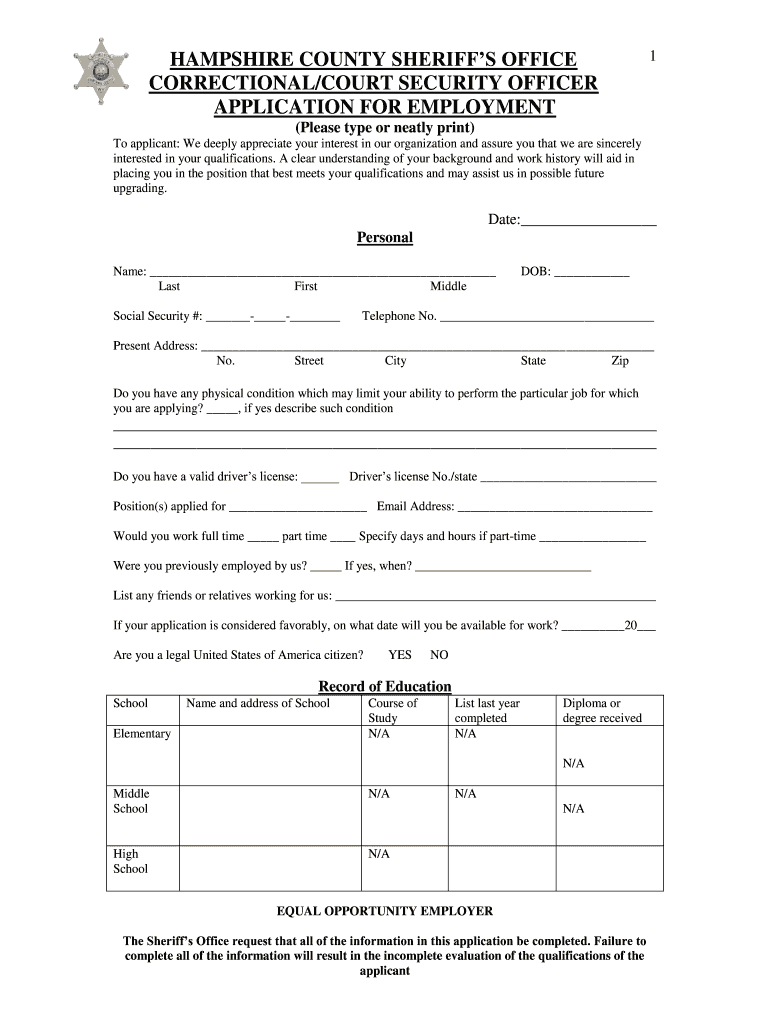 HAMPSHIRE COUNTY SHERIFFS OFFICE CORRECTIONAL/COURT SECURITY OFFICER APPLICATION FOR EMPLOYMENT1(Please type or neatly print) To applicant: We deeply appreciate your interest in our organization and