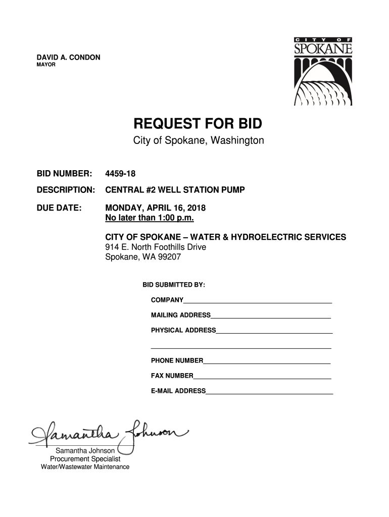 DAVID A. LONDON MAYORREQUEST FOR BID City of Spokane, Washington BID NUMBER:445918DESCRIPTION:CENTRAL #2 WELL STATION PURDUE DATE:MONDAY, APRIL 16, 2018, No later than 1:00 p.m. CITY OF SPOKANE WATER