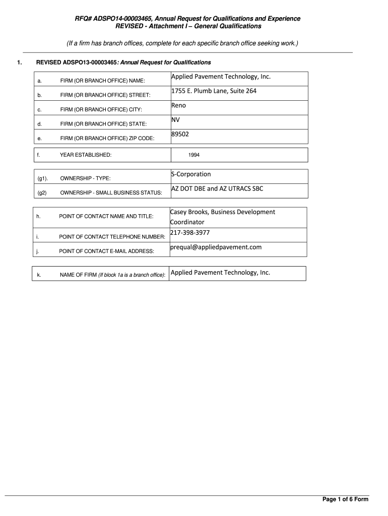 RFQ# ADSPO1400003465, Annual Request for Qualifications and Experience REVISED Attachment I General Qualifications (If a firm has branch offices, complete for each specific branch office seeking work.)