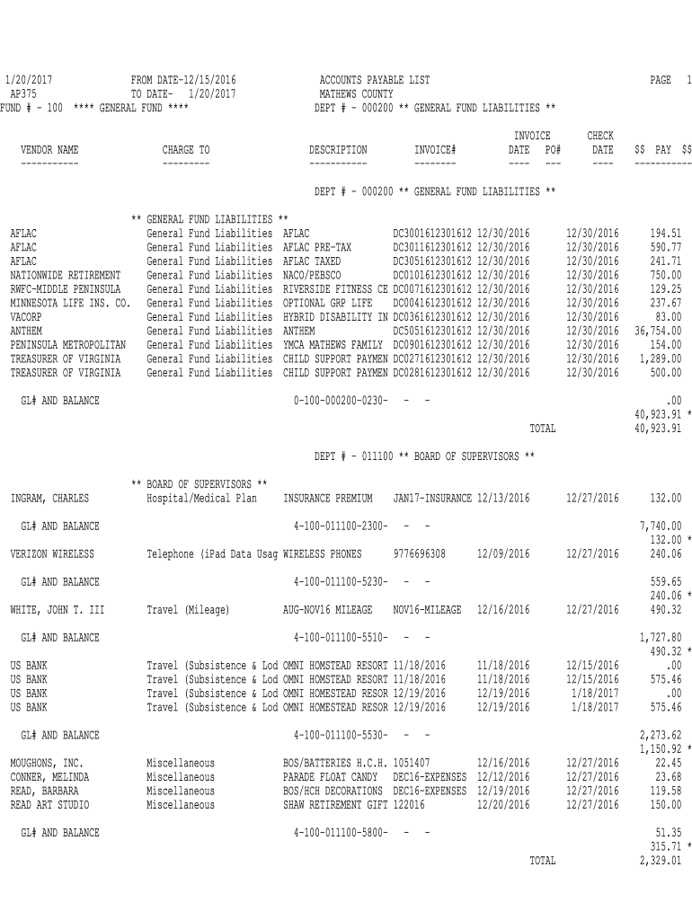 1/20/2017 AP375 FUND # 100FROM DATE12/15/2016 TO DATE1/20/2017 **** GENERAL FUND ****VENDOR NAME ACCOUNTS PAYABLE LIST MATHEWS COUNTY DEPT # 000200 ** GENERAL FUND LIABILITIES **CHARGE TO DESCRIPTION