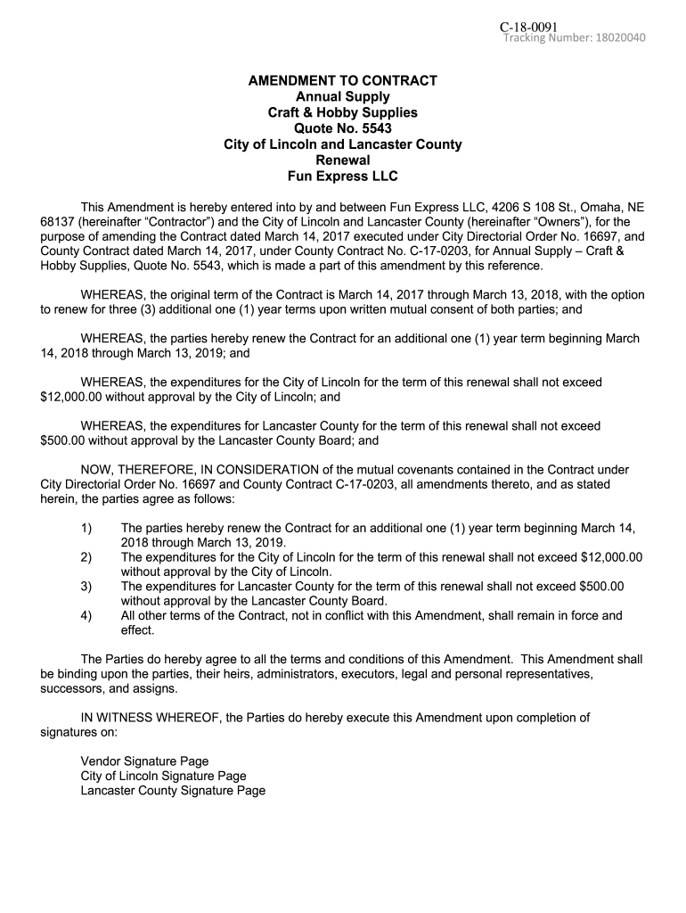 C180091Tracking Number: 18020040AMENDMENT TO CONTRACT Annual Supply Craft & Hobby Supplies Quote No. 5543 City of Lincoln and Lancaster County Renewal Fun Express LLC This Amendment is hereby entered