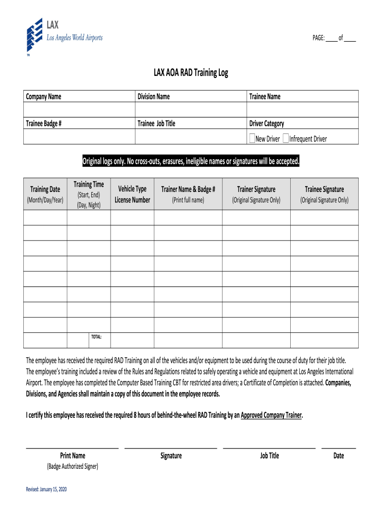 PAGE: of LAX AOA RAD Training Log Company NameDivision Lamebrained Badge #Trainee Job Title Driver Category New DriverInfrequent DriverOriginal logs only. No crosscuts, erasures, ineligible names